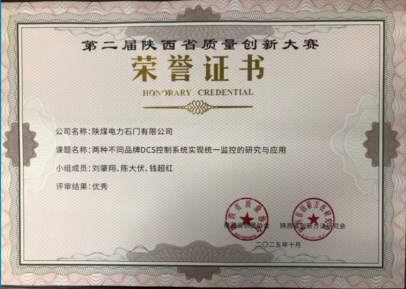 近日,在第二屆陜西省質量創(chuàng)新大賽中,陜煤電力石門有限公司申報《兩種不同品牌DCS控制系統實現統一監(jiān)控的研究與應用》榮獲優(yōu)秀獎。《...